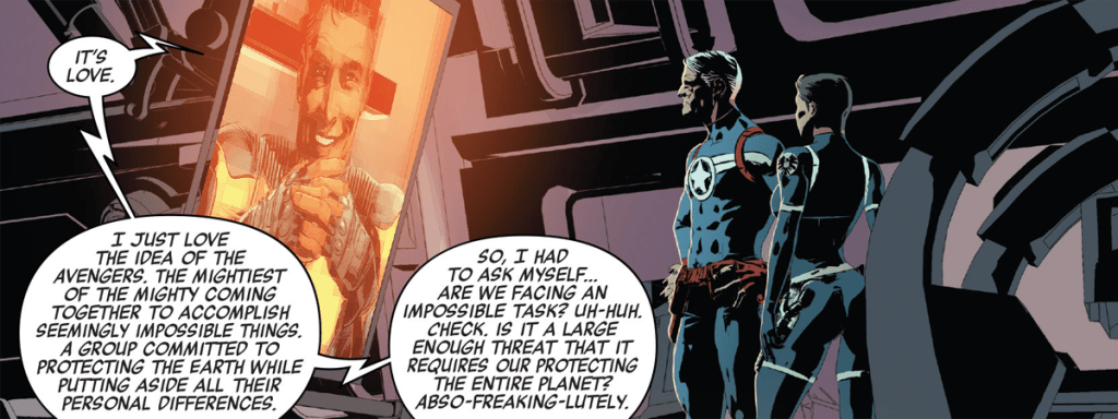 Towards the end of Hickman’s run on Avengers and New Avengers, the two series jumped forward eight months as part of a story called “Time Runs Out.” Within this story, the Avengers had been fractured following Captain America’s discovery that the universe was dying and not only did Iron Man and the Illuminati keep that from him, he actually already knew it but they mindwiped him to make him forget. When we skip forward eight months, Captain America is leading a SHIELD sponsored Avengers team to hunt down Iron Man’s Illuminati but when they finally come to blows, they’re interrupted by the arrival of Roberto Da Costa himself and his own Avengers team.