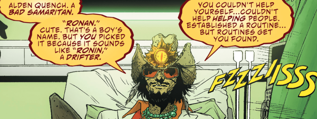Neon’s dark counterpart is Alden Quench, a drifter known as The Bad Samaritan who is empowered by The Fires of Creation’s opposing force; The Fires of Destruction. Similarly to Neon The Unknown, The Bad Samaritan tried to witness the source of creation and was cursed by his hubris. Now, he is driven by a nagging pain in his mind inflicted by a dark master — who we’ll get to shortly — and that regularly brings him into contact with Neon The Unknown and The Unexpected. It’s his desire to acquire The Conflict Engine that leads him to find Firebrand in the first place and brings all of these characters together, kicking off a mad scramble to save the multiverse.