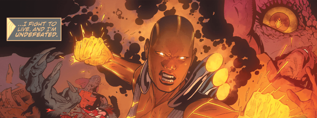 The other main character of The Unexpected is Neon The Unknown, formerly a celebrity artist by the name of Colin Nomi. Seeking inspiration, Nomi performed a rite which gave him brief access to The World Forge — a concept introduced in Dark Nights: Metal, where new worlds are born and either ascend into the larger multiversal structure or are cast down into the Dark Multiverse to die. That brief moment cost Colin his sight but granted him control of The Fires of Creation, which allowed him to bend mortal materials to his will. Along with his allies Viking Judge and Ascendent, Neon The Unknown set out to defend the multiverse from threats the regular hero set didn’t even know were a problem.