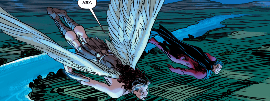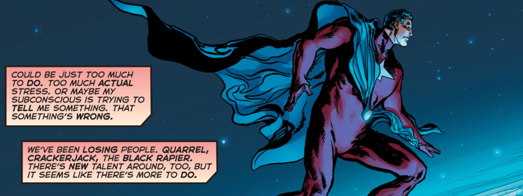 That’s really key to understanding the heartbreak of Samaritan. I nearly wrote tragedy, but it’s not quite that, but I think heartbreak fits. He’s someone that really loves being Samaritan and finds real fulfillment in his role as humanity’s protector and savior, but what he really wants to do is fly freely. You’d think he’d get to do that, but he’s only ever flying from one place to another and as he notes at the end of the issue he only clocks in fifty-six seconds of airtime throughout the entire day and that’s the most he’s got in months.