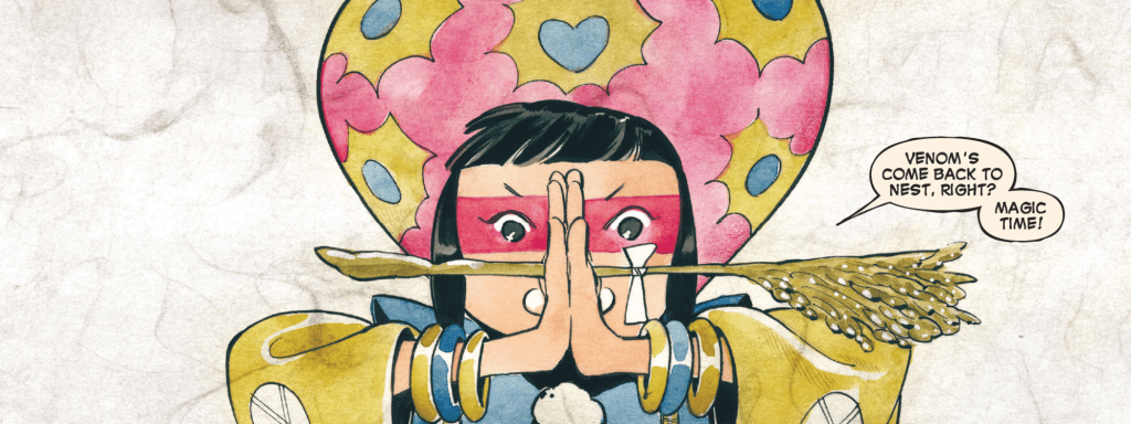 What I liked most about the reimaginings within this issue is that despite being called Demon Days: X-Men, it doesn’t limit itself to characters within the X-Men bubble. There’s a take on Venom who is a giant snake living in a cave while The Hulk is an Oni that wreaks havoc on a small village and Black Widow makes a small appearance towards the end where she seems to be a headteacher or some kind of guardian of children. It’s a more expansive vision of the Marvel Universe than you’d think it would be based on the title and it just gives Momoko more tools to play with in future instalments.