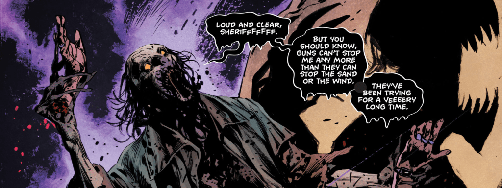 Mike Perkins is an artist that’s always been really hit and miss for me. I liked him as the pitch-hitter for Steve Epting on Captain America and his Union Jack miniseries was a lot of fun, but his more recent work on Iron Fist and Lois Lane hasn’t hit the spot for me. However, I think horror is really where he excels — he drew Marvel’s adaptation of The Stand a decade ago — and this is probably the best work of his career, especially with the gorgeous double-pages spreads in this issue. Mike Spicer’s colours deserve their own shout-out too as the perfect compliment to the horror Perkins’ is inflicting on us and I was psyched to see Aditya Bidikar’s work on a big two title; the custom balloons for The Pale Wanderer are a particular highlight.