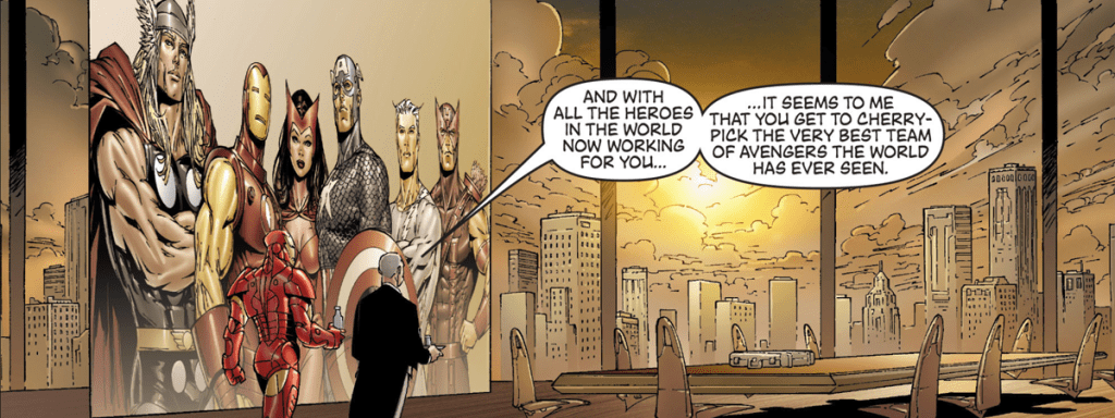 Finally, what’s especially interesting is that while it doesn’t allude to it, this final vignette features two characters who would go on to be revealed as Skrull agents during Secret Invasion; Edwin Jarvis and Spider-Woman herself. Bendis had been planting hints of Secret Invasion since his first issue of New Avengers when Skrull agents hired Elektro to cause a blackout at the supervillain prison The Raft, so it’s likely that he knew both Spider-Woman and Jarvis were Skrulls when he was writing this scene, subtly influencing things from behind the curtain to prepare the Marvel Universe for their big attack.