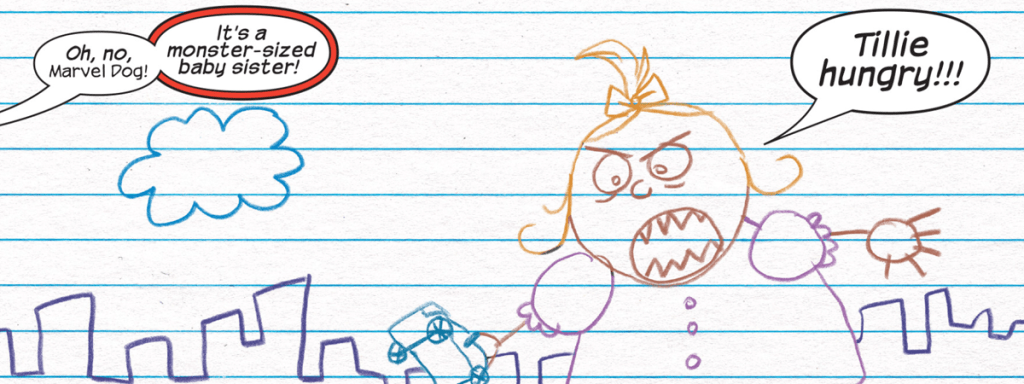 Gus Beezer is a young child who lives in the suburbs with his family; a mother and father and two sisters, one older and one younger. I don’t think his age is given and I’m really bad at guessing how old kids are, but I’d say he’s maybe about seven years old, or maybe ten? I’m not sure. He goes to school with friends like August and James, and rival Dubar Dilpepper who is more a traditional comic nerd type of kid. The only difference between Gus Beezer and a regular kid is that Gus Beezer lives in the Marvel Universe.