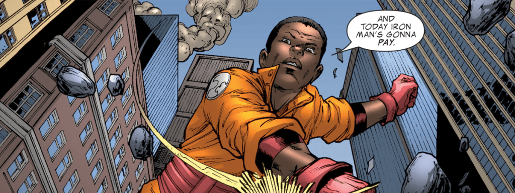Civil War kinda brushes past the human cost of Goliath’s death, it’s a story beat to reinforce Captain America’s position and make Iron Man question his own but Greg Pak takes the opportunity to run flesh out the aftermath of Bill Foster’s death by introducing his nephew Tom Foster, who justifiably wants revenge against Iron Man for the death of his uncle. He first appeared in World War Hulk as a leading voice among the pro-Hulk civilians but in this issue he sneaks into Avengers Mansion and gets his hands on Pym Particles, growing to giant size in order to attack Iron Man. However, by the end of the story he willingly puts his hate aside in order to protect people as his uncle would have.