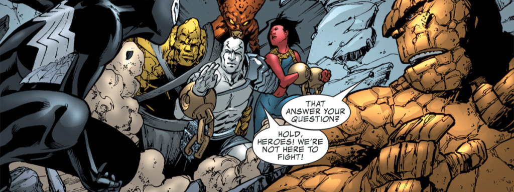 The Warbound start this issue in SHIELD custody but they break out when things kick off between the Hivelings and the native Sakaraans who blame each other for events of the attack on Manhattan. However, they find themselves stopped by Spider-Man, The Thing and Luke Cage, leading to a big brawl. Elloe slips past the heroes to try and stop the warring aliens but gets stabbed in the chaos and Hiroim uses his Oldpower, channelled through the rocky forms of The Thing and Korg, to fix the growing chasm. As the dust settles, the Warbound slip away from SHIELD forces and run away out of the book and into their own spin-off miniseries.