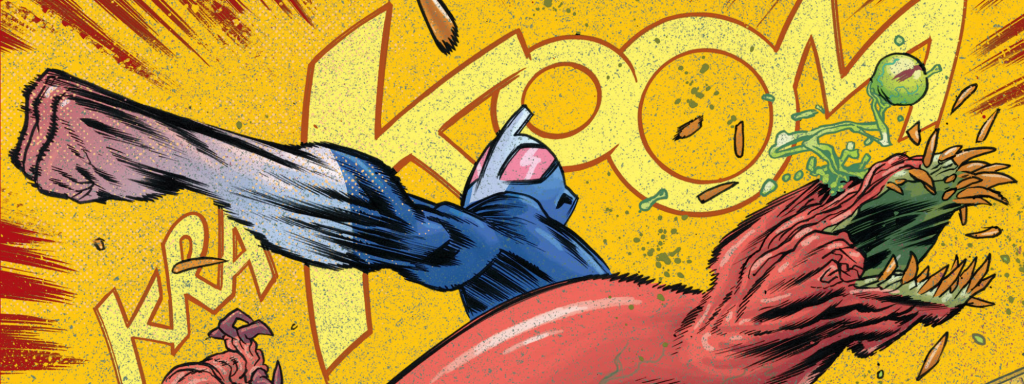 I don’t have a massive familiarity with the tokusatsu/kaiju genres, I must admit. The genres ticks a lot of my individual boxes, but on the whole I’ve never been extraordinarily compelled to invest in it outside of outliers like Pacific Rim or James Stokoe’s Godzilla: The Half Century War. I’ve always wanted to like Ultraman, because it feels like the best crossover from my comfort zone of superheroes into the world of giant monster battles, but Marvel’s recent series didn’t click for me. However, Ultramega hits the sweet spot absolutely perfectly.