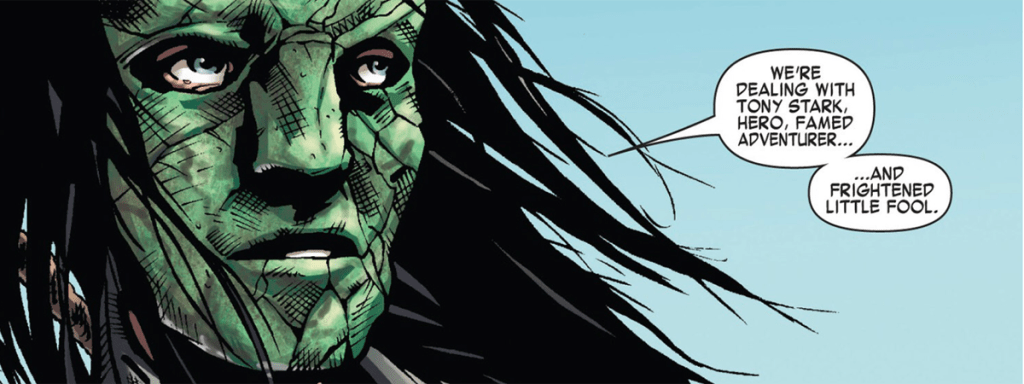 Tony Stark is a heroic adventurer who travels the world with a group of allies which include his loyal aide James Rhodes, his assistant and lover Gialetta Nefaria and his chronicler Virgil Munsey. While searching for a mystical mask in the middle of the rainforest, Nefaria betrays Stark’s team and reveals her allegiance to a group of Nazis, led by Baron Heinreich Zemo and Baron Wolfgang Von Strucker. Munsey is killed while Stark and Rhodey escape barely, by starting a fire which fuses the mask to Nefaria’s face, turning her into this reality’s version of Madame Masque.