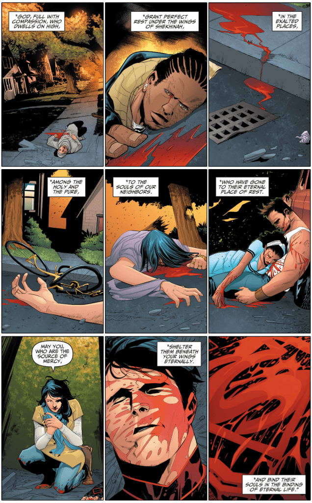 I have to tell you that when I opened this comic — which is largely an inconsequential and forgettable comic both in the scope of the DC Universe as a whole as well as within Tom King’s career — and saw the first page, I burst out laughing. If you ask someone with a passing familiarity of King’s work what they associate with him as an author, the first thing they’d say would probably be the nine panel grid layout. The second thing they might say would be that his comics use themes, quotes or imagery relating to religion and spirituality contrasted against the worlds of superheroes in order to give everything happening more narrative weight.