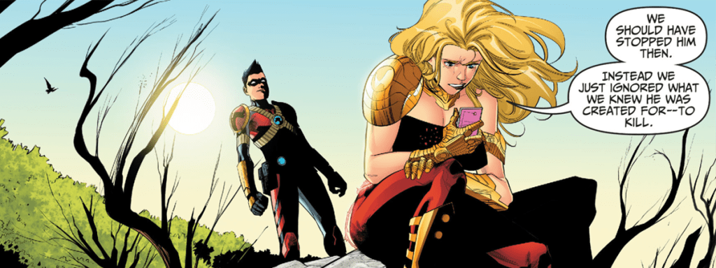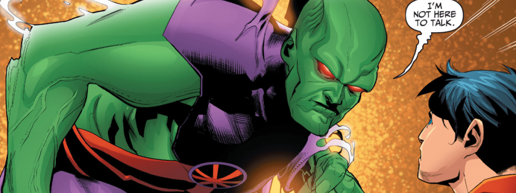 That’s just the first page and I want to be charitable to the whole comic, although it’s not a comic I enjoyed. As I mentioned, everyone thinks Superboy killed a bunch of people but they’re actually Durlans, shapeshifting aliens. Red Robin wants the Teen Titans to help him while Wonder Girl doesn’t think she can trust him anymore; the Martian Manhunter wants justice for the dead and Ra’ut L’lwer is the only surviving Durlan who wants to help Superboy prove his innocence.