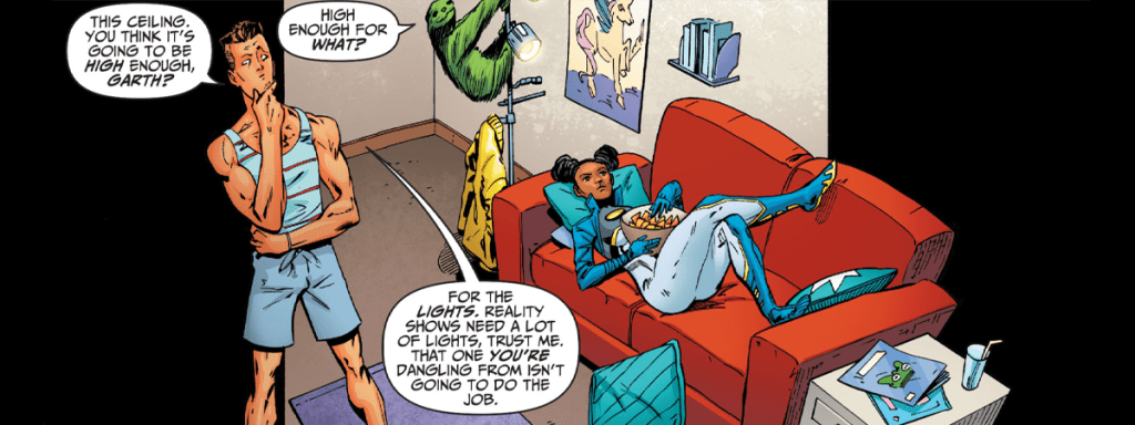 That’s part of the problem too in that from what I can tell, this is essentially Teen Titans #8.5 and I don’t want to go read the issues either side of it to make better sense of what’s going on and where the story’s going. Ostensibly it’s a jumping on point but the main plot left me cold and uninterested. However, I did enjoy some of the background stories like Beast Boy and Bunker getting ready for a supposed Teen Titans reality show and Raven’s side-gig with what seems to be an emo or metal band. The appeal of the Teen Titans is all in the characters and their interpersonal relationships, and when this comic leans into that it’s a lot more enjoyable.