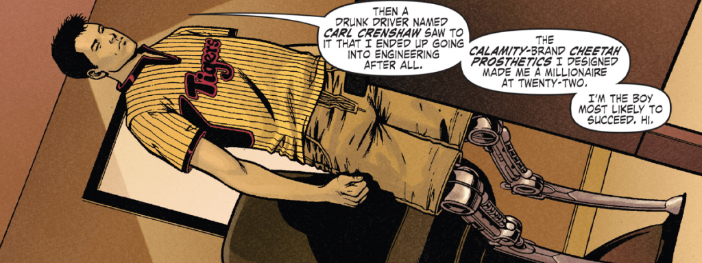 What I find really interesting about The Order is that of its seven member team, three of its heroes are physically disabled. James Wa, aka Calamity, was an engineering student/baseball prodigy who got hit by a drunk driver and lost his legs; Milo Fields, aka Supernaut, was an US Marine who got shot in the back protesting the government’s use of his story for propaganda purposes and Dennis Murray aka Heavy was a navy officer who got caught in the same explosion as Tony Stark did but was left with full-body paralysis.
