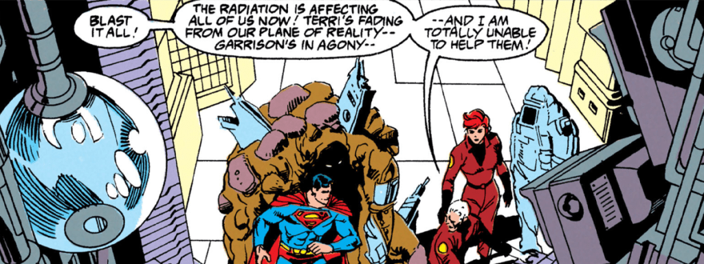 Steve’s body becomes a walking reactor, Jim’s body reconstitutes itself from the metal and rubble from the crash and Terri’s body starts slowly phasing into another dimension. The only effect Hank seems to experience is that of what would happen to a regular person whose body was flooded with radiation, as the skin starts to slough off his bones. Excalibur’s crew goes to Lexcorp to try and find a way to reverse the process but after a misunderstanding gets into a fight with Superman which costs them precious time and ultimately, only Terri survives.