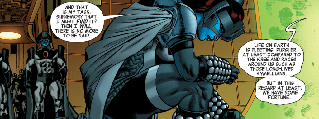 So, discussing this story on its own merits, it’s less about the Invaders and more about the threat they’re going to face in their new series. The Supreme Intelligence of the Kree tasks Tanalth The Pursuer wiith reassembling The God Whisper, a Kree weapon that can take control of gods, which was lost during World War II and split into three parts. As I said, I have no intention of reading All-New Invaders Tanalth herself will go on an interesting journey beyond this in the pages of Empyre where she’s going to be revealed to be a Skrull all along. Maybe one day I’ll read All-New Invaders but today is not that day.